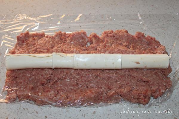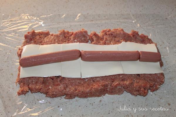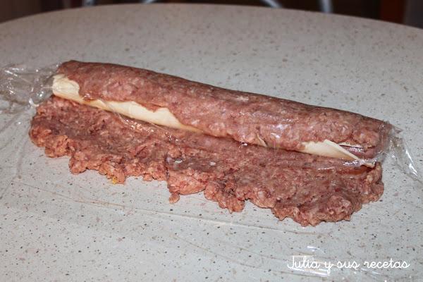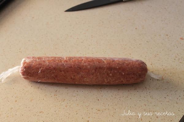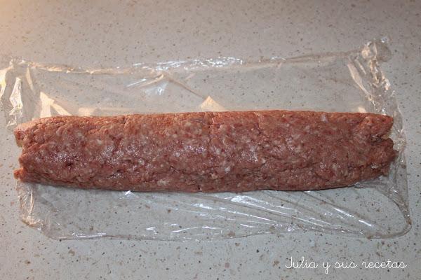 Y a continuación enrollamos la carne ayudados con el film alrededor de la salchicha.