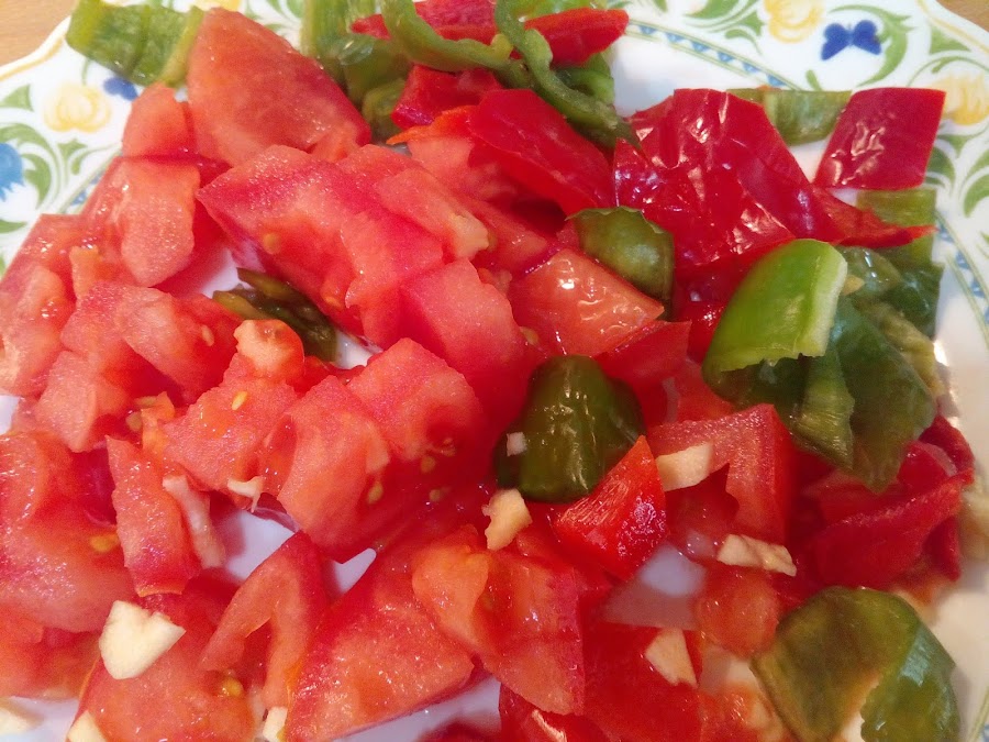 Lavar los pimientos y el tomate, pelar los ajos y picar todo en trozos pequeños.