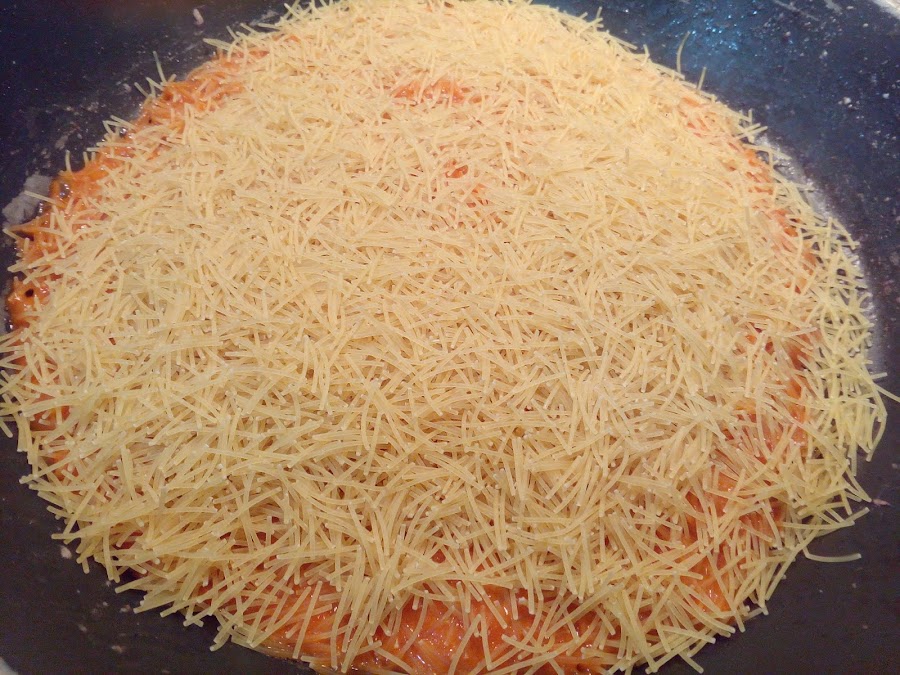 Bajar el fuego al mínimo, cociendo los fideos un minuto más, retirar la sarten del fuego, tapar con papel de aluminio durante un minuto más a fin de que los fideos absorban todo el caldo.