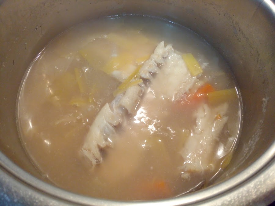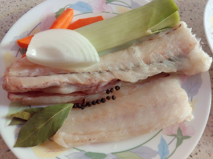 Un trozo de cebolla, un puerro, dos zanahorias medianas, diez granos de pimienta negra, dos hojas de laurel, un litro de agua, sal y la espina de dos rosadas (pescado blanco. A veces uso cabezas y espinas de otros pescados como merluza, huesos de la espina central de pez espada o cabeza de rape).