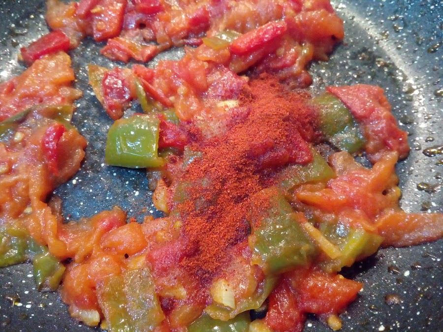 En el mismo recipiente donde se han salteado los chopitos (sin enjuagarlo siquiera, aprovechando así parte de sus jugos), echar aceite de oliva virgen extra y sofreir la verdura, salando al gusto, hasta que esté bien pochada. Incorporar el pimiento molido removiendo bien a fin de que se integren todos los ingredientes.