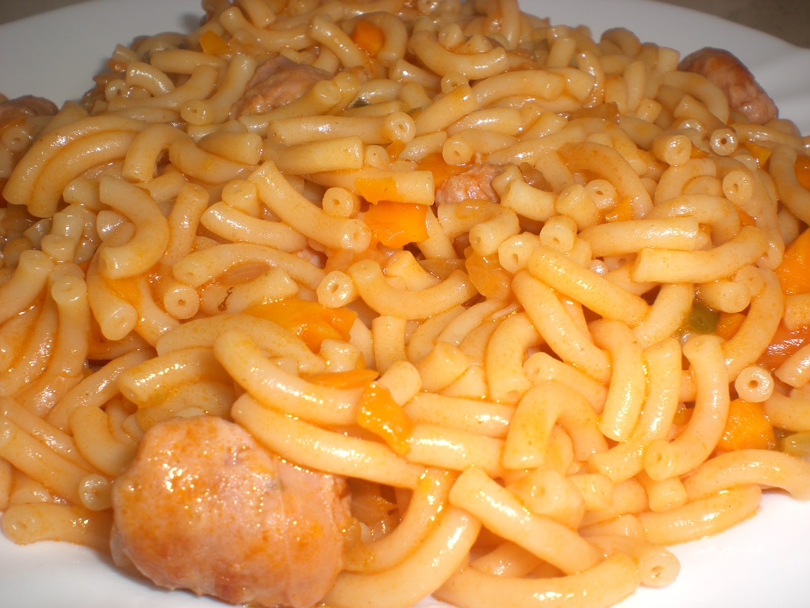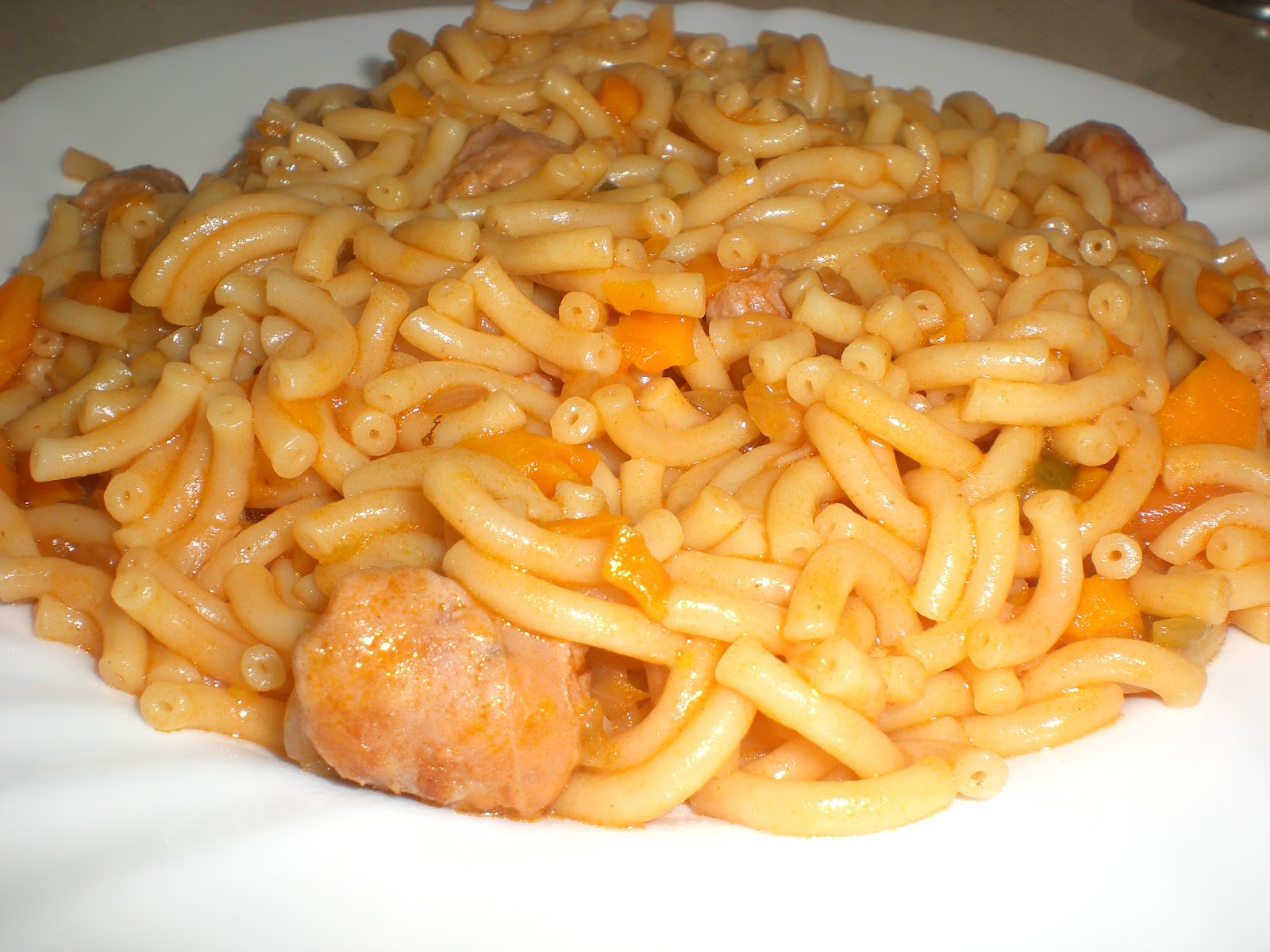 Ingredientes (salieron 3 platos) 150 gr carne de magro (yo le puse tres salchicas) 1 cebolla 1 ajo 1 zanahoria pequeña o media mediana 1 pimiento verde 3 cd soperas de tomate frito 1/2 pastilla de caldo de carne aceite de oliva sal 2 y 1/2 vasos medidores de fideos de fideua (de los que llevan agujerito dentro, no los finos de angel) 600 ml agua un chorrito de vino blanco Conectamos la olla en menú cocina y ponemos un chorrito de aceite de oliva. Mientras calienta, cortamos en daditos las salchichas y las incorporamos a la cubeta. Aprovechando que se dora la carne, picamos la cebolla y el ajo y lo añadimos a la olla. Picamos también el pimiento y la zanahoria y también los incorporamos. Cuando esté algo doradito, añadimos el tomate y damos un par de vueltecitas. Echamos el chorrito de vino blanco que evapore un minutito. Ponemos los fideos, salamos y removemos un minutito o dos. A continuación, vertermos el agua e incorporamos la media pastillita de caldo de carne. Cerramos la olla y que acabe el programa cocina 8 minutos válvula cerrada. Al terminar el programa, despresurizamos manual, abrimos, dejamos reposar un poco los fideos...