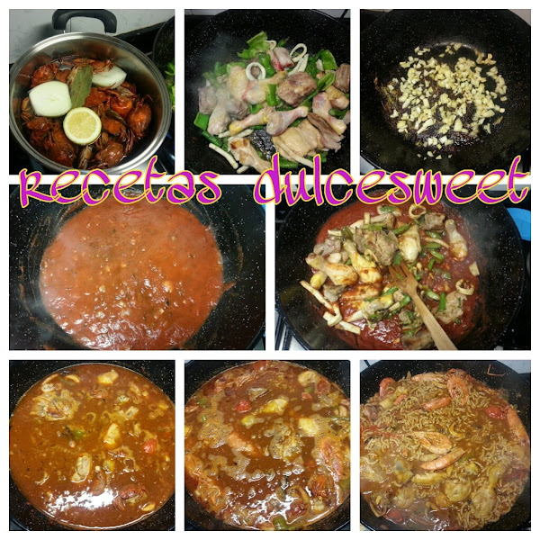 Este Lunes que a sido fiesta y venían mis tíos a comer a casa de mi madre, hicimos una buena paella de fideos a la cazuela, con su pollo, costillas, espárragos, gambas, cangrejitos...ummmm que ricooooo!!!