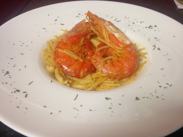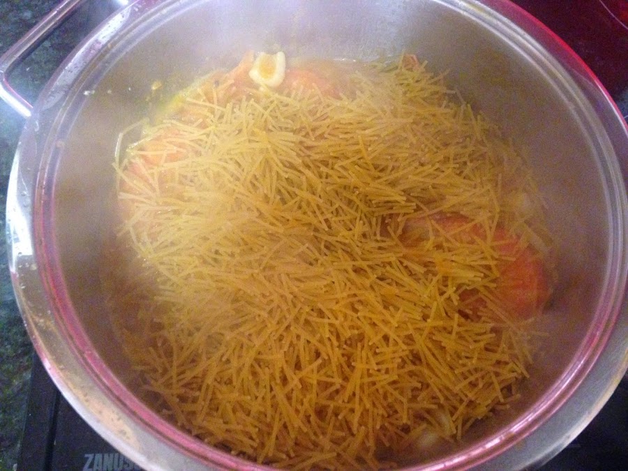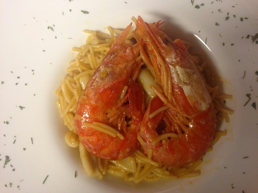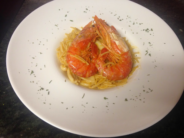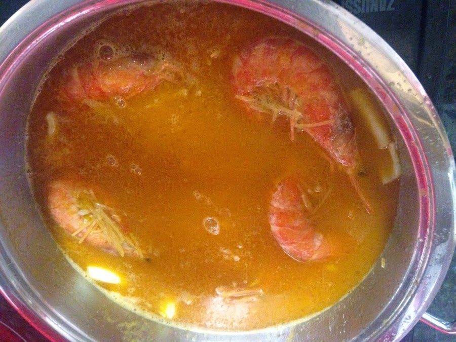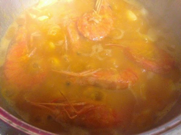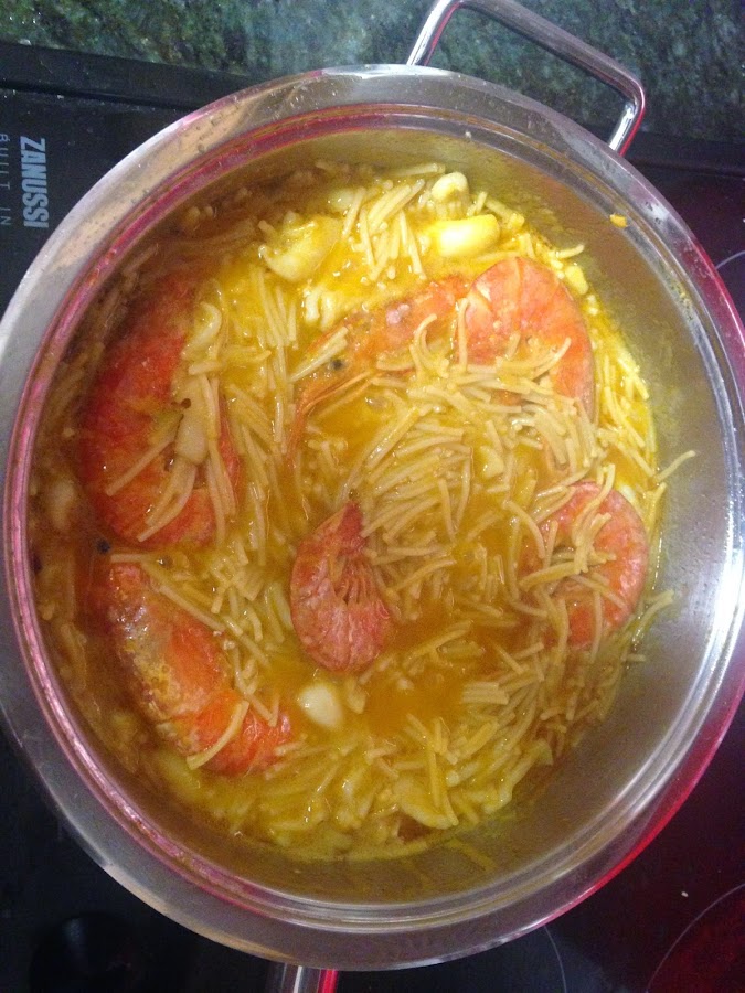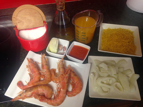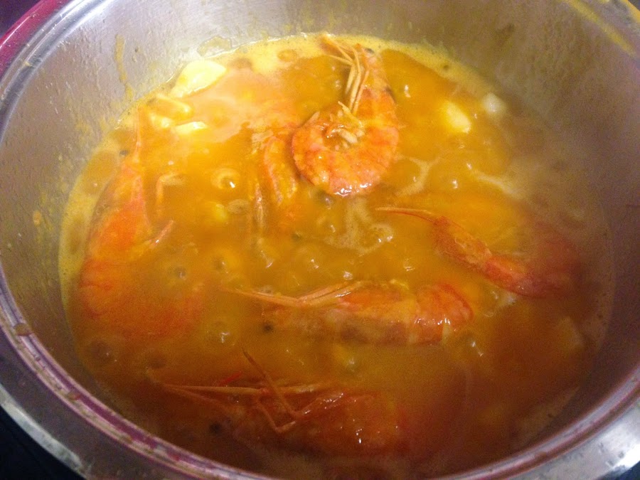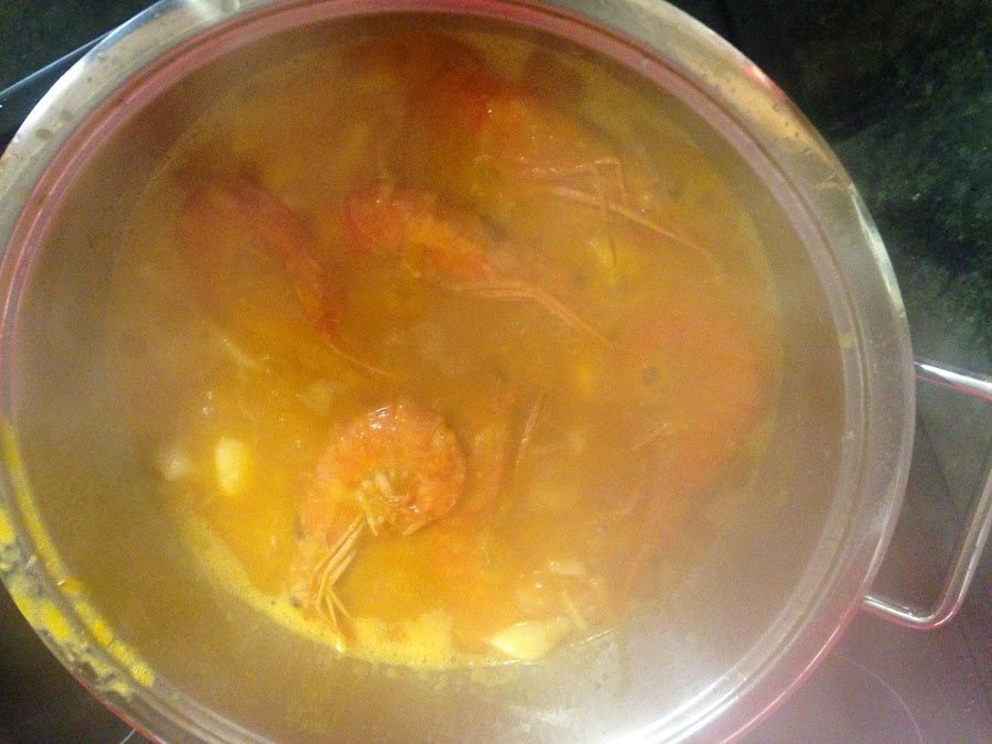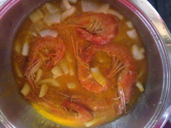 Cuando este todo cortado lo añadiremos a las gambas, lo dejaremos cocer a fuego lento.