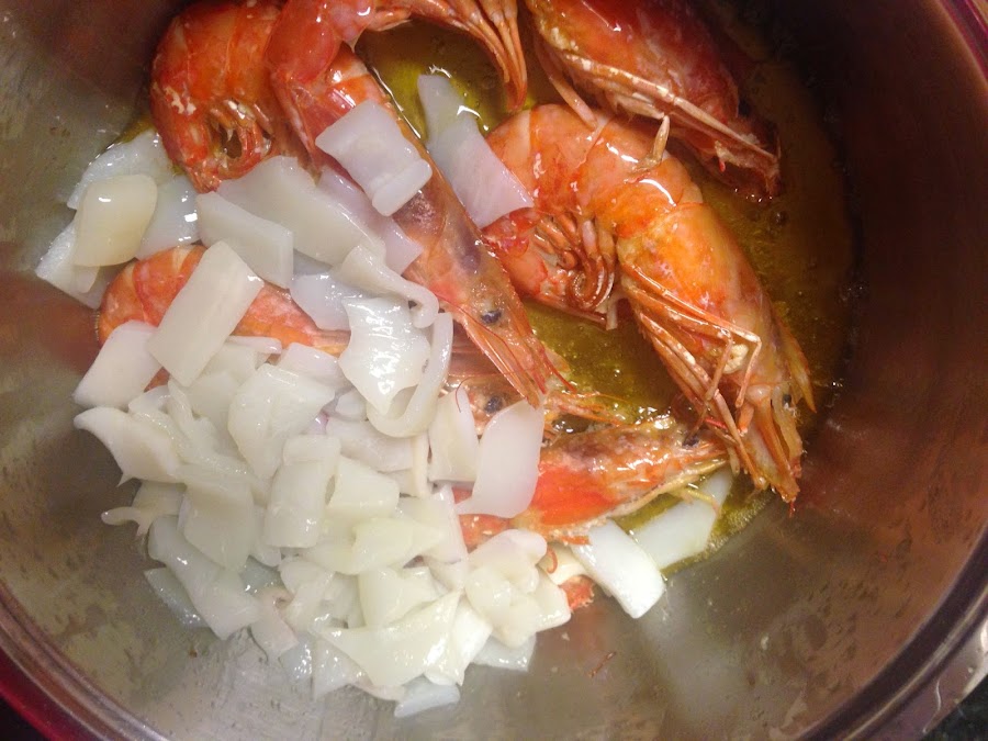 Lo añadiremos a las gambas y al calamar. Dejaremos reducir durante 5 min a fuego lento.