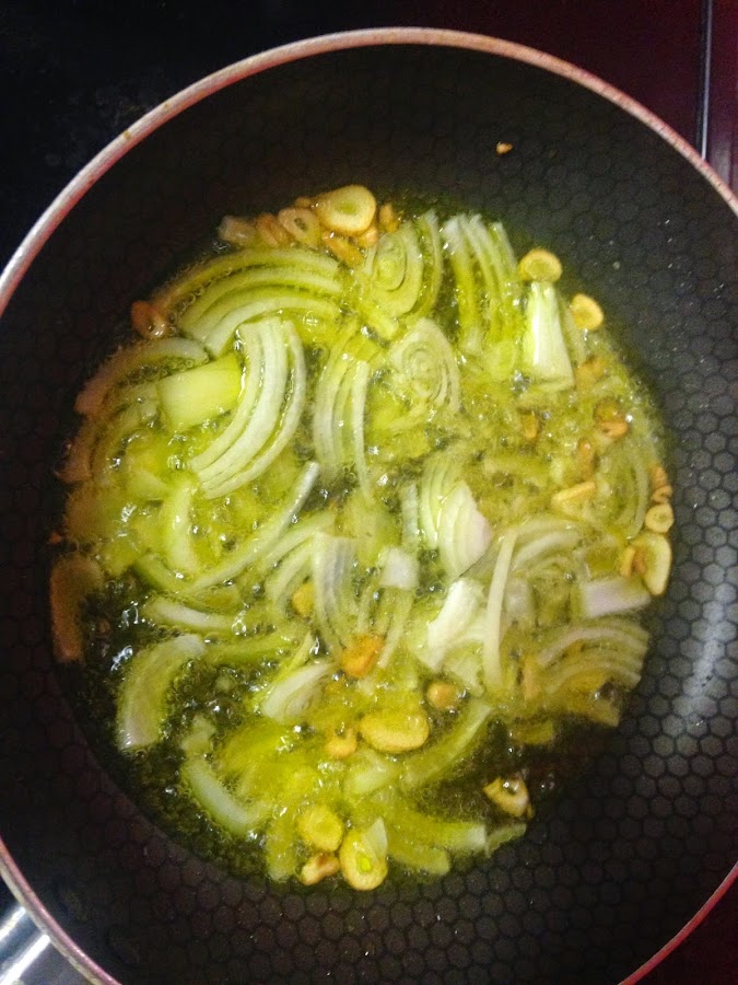 Cuando los ajos esten doraditos hecharemos la cebolla y dejaremos que se vaya dorando a fuego lento.