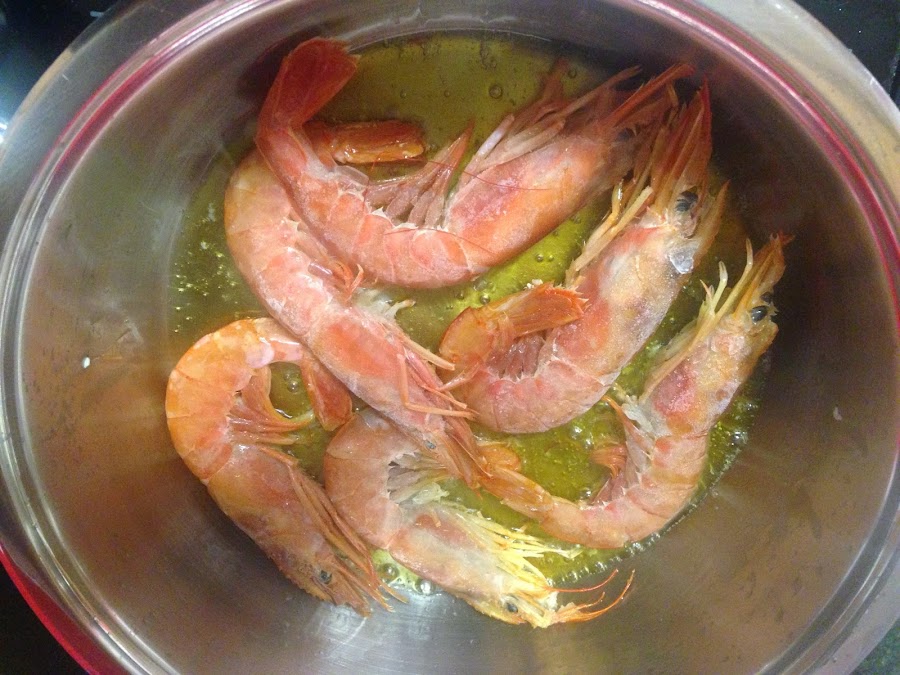 Pondremos otra cazuela con aceite de oliva, pondremos las gambas que se vayan haciendo a fuego medio.