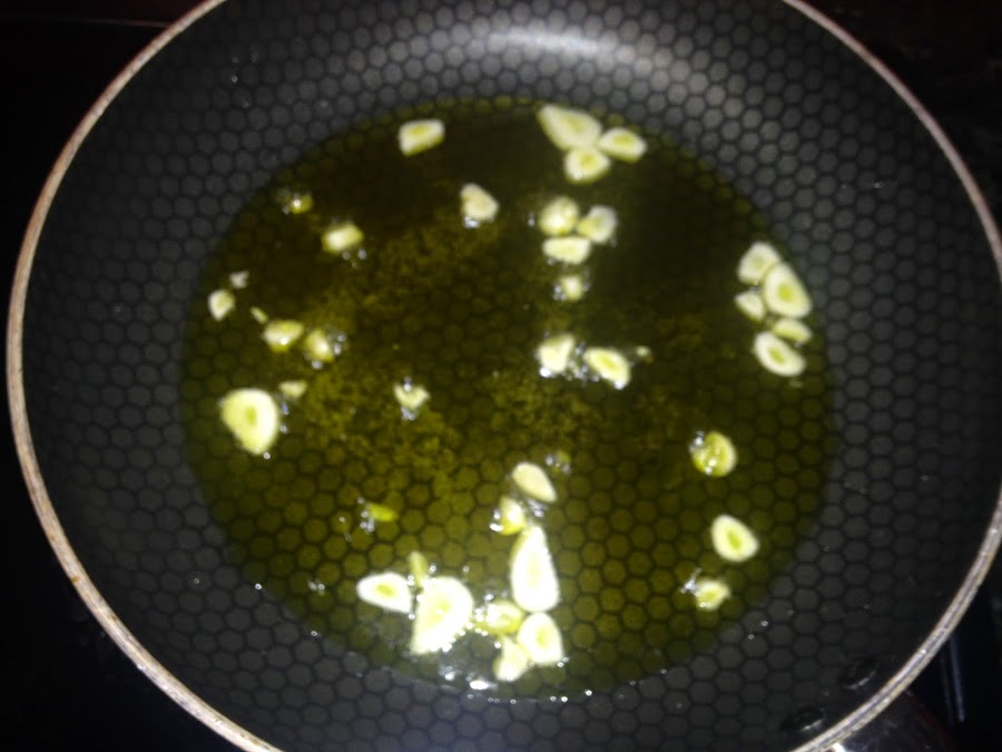 Empezaremos poniendo una sarten al fuego con aceite de oliva, seguiremos pelando los ajos y los laminaremos.