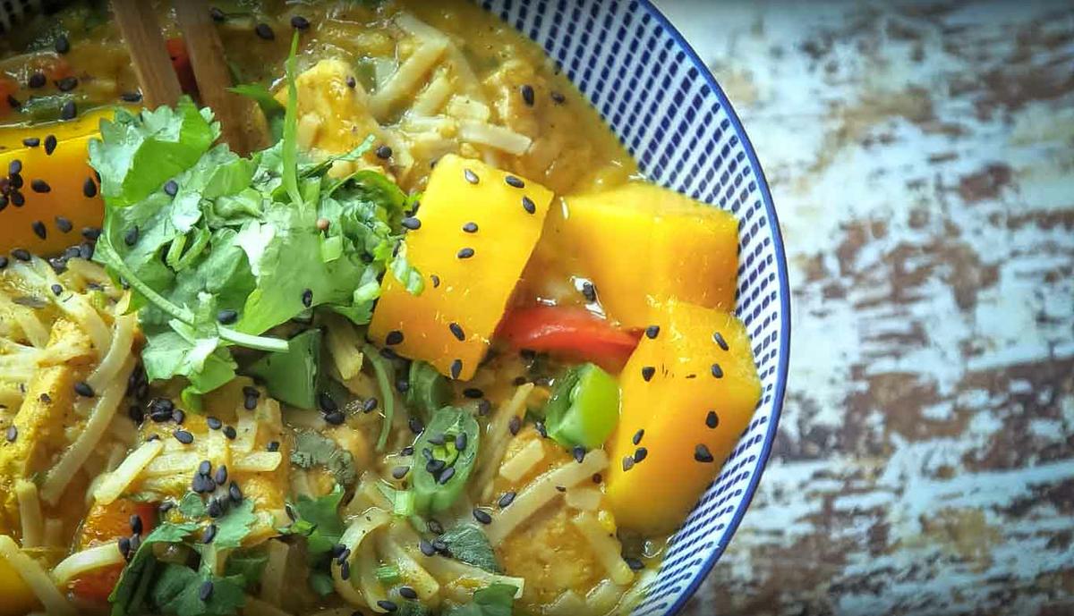 Receta fideos al curry de mango con tempeh