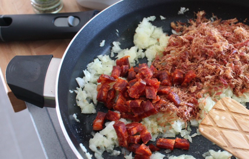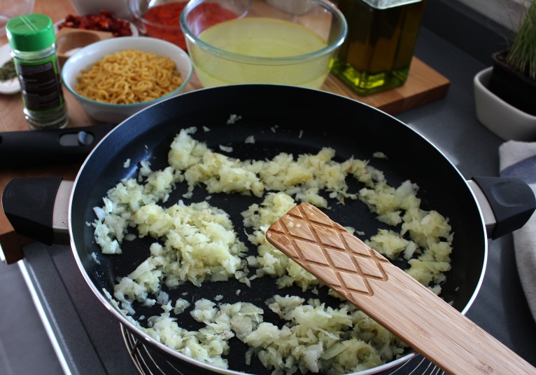 En una sartén, con un poco de aceite, pochamos la cebolla, bien picada.