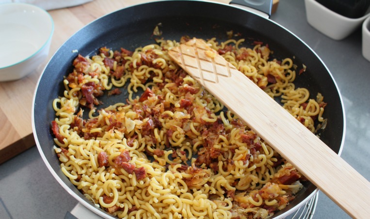 Añadimos un poco más de aceite y salteamos los fideos. (2-3 minutos)