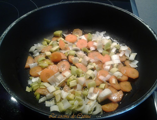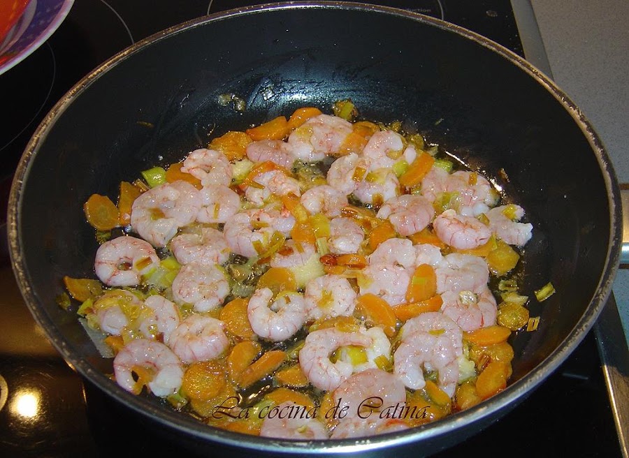 Limpiar las gambas, mientras vamos haciendo el sofrito. En una sartén con un chorrito de aceite, freímos la zanahoria y el puerro picado en trozos pequeños, dejándolo al dente.
