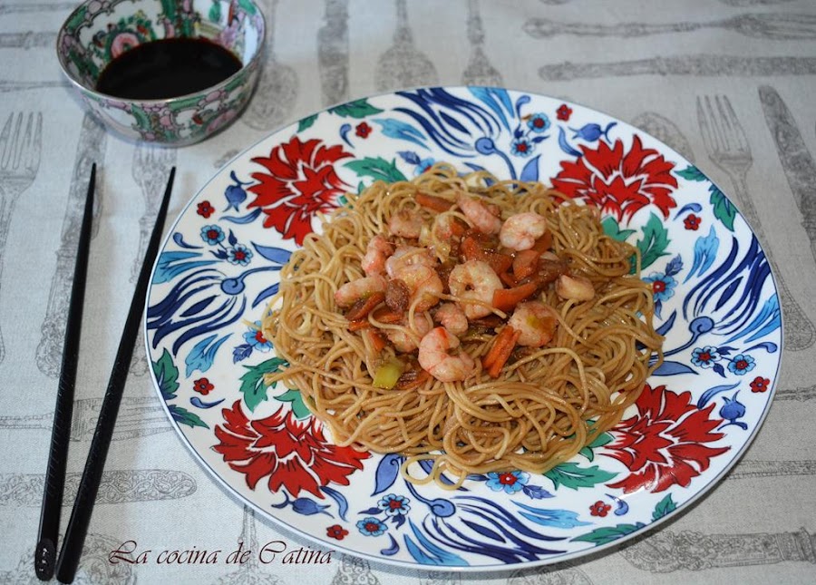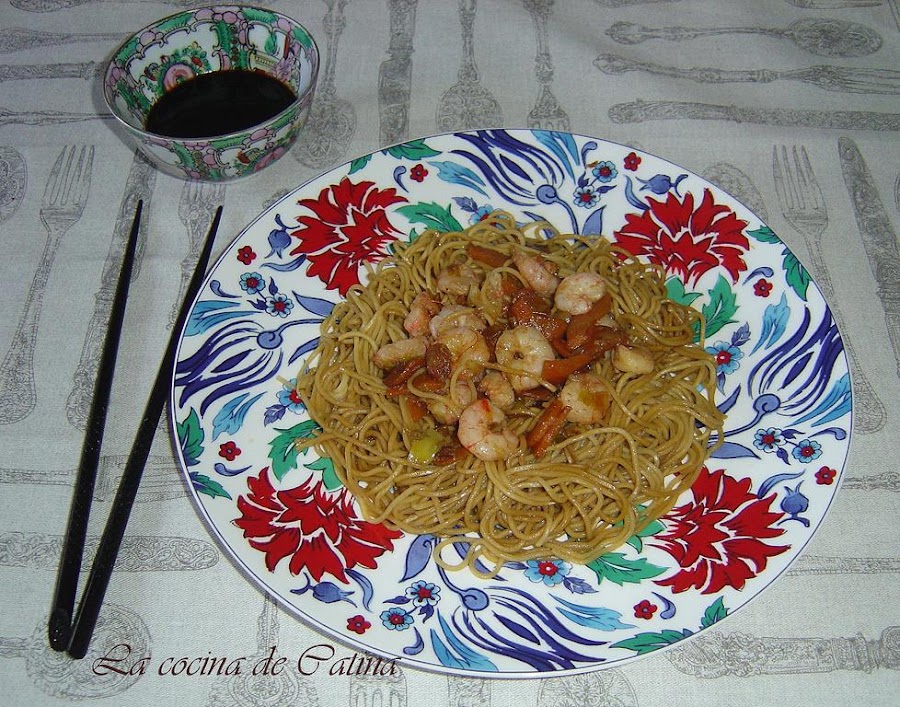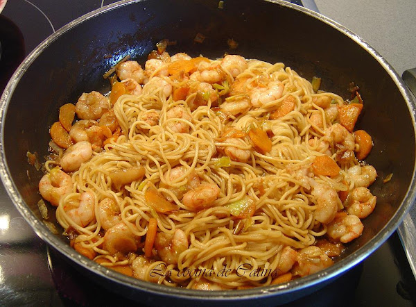 Incorporamos los fideos de arroz y un buen chorro de salsa de soja, mezclamos todo bien para que se integren los sabores