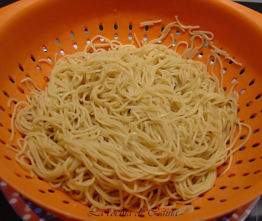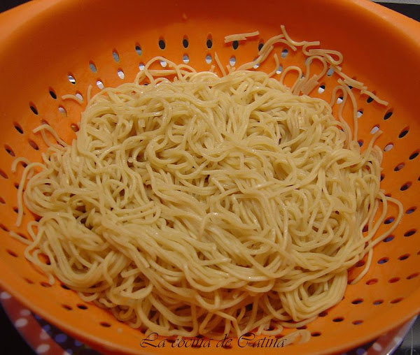 Hervir los fideos en agua con sal, escurrirlos y refrescarlos con agua fría.