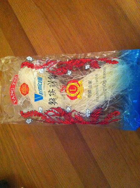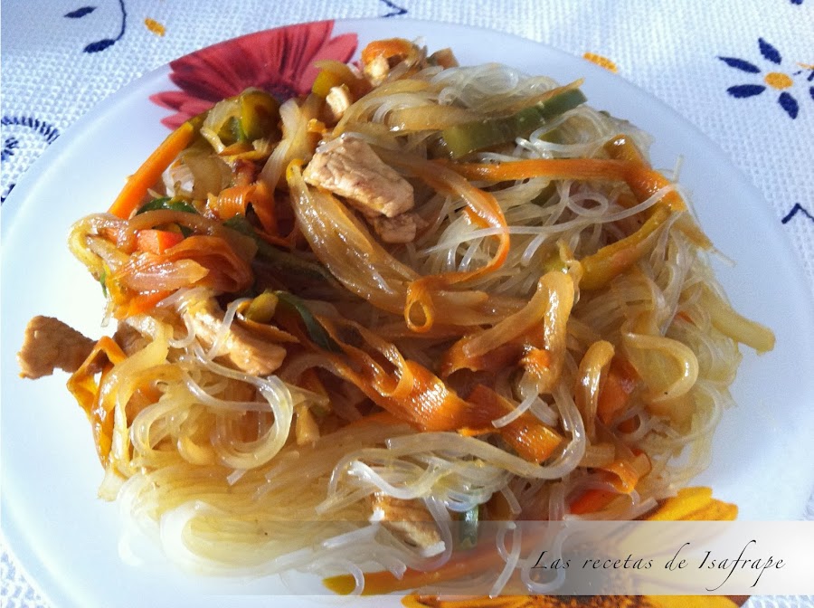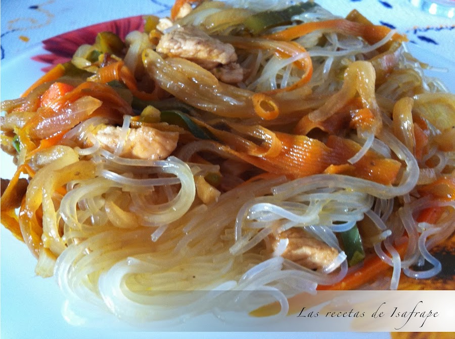 Pelamos y lavamos la cebolla y la zanahoria y las cortamos a juliana (finas). Lavamos el pimiento y lo cortamos también a tiras finas. Hacemos los fideos chinos como indique el paquete. En la foto os muestro los fideos que suelo emplear, que son los habituales en los supermercados. El paquete trae cinco paquetitos y yo emplee tres para dos platos.