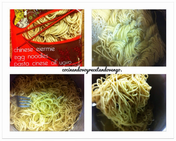 Mientras que preparamos las verduras a la vez calentamos una olla con agua y sal. Dejamos hervir y una vez esté hirviendo, apagamos el fuego y añadimos los fideos chinos. Removemos con un tenedor para desliarlos y dejamos el tiempo que nos indique el fabricante (suelen ser pocos minutos) Escurrir y si está la verdura lista, mezclar y servir. El resultado es un plato completo, saludable, colorido y delicioso que gusta a todos con aroma a naranja que me encanta!!