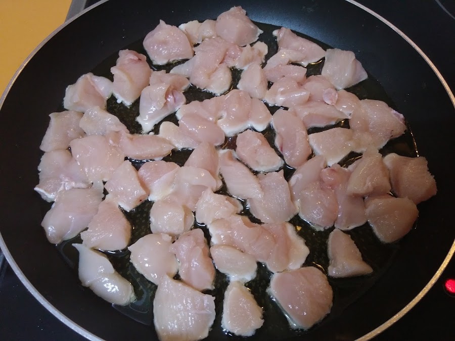 Ahora añadimos el pollo a la sartén.