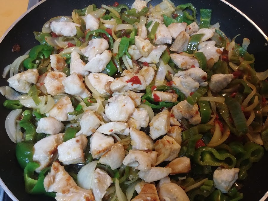 Y cuando el pollo esté listo, lo apartamos y en esa misma sartén vamos a sofreír la verdura. Salamos al gusto.