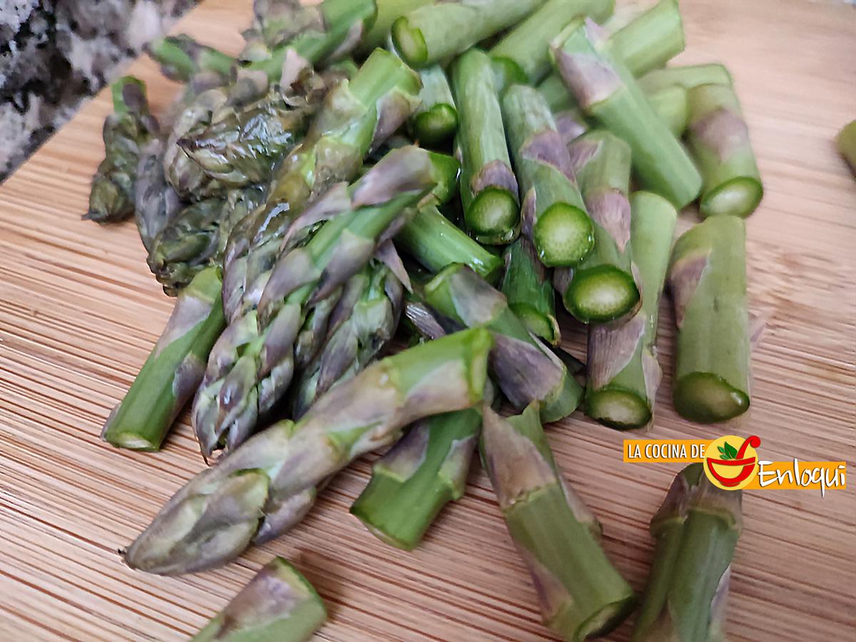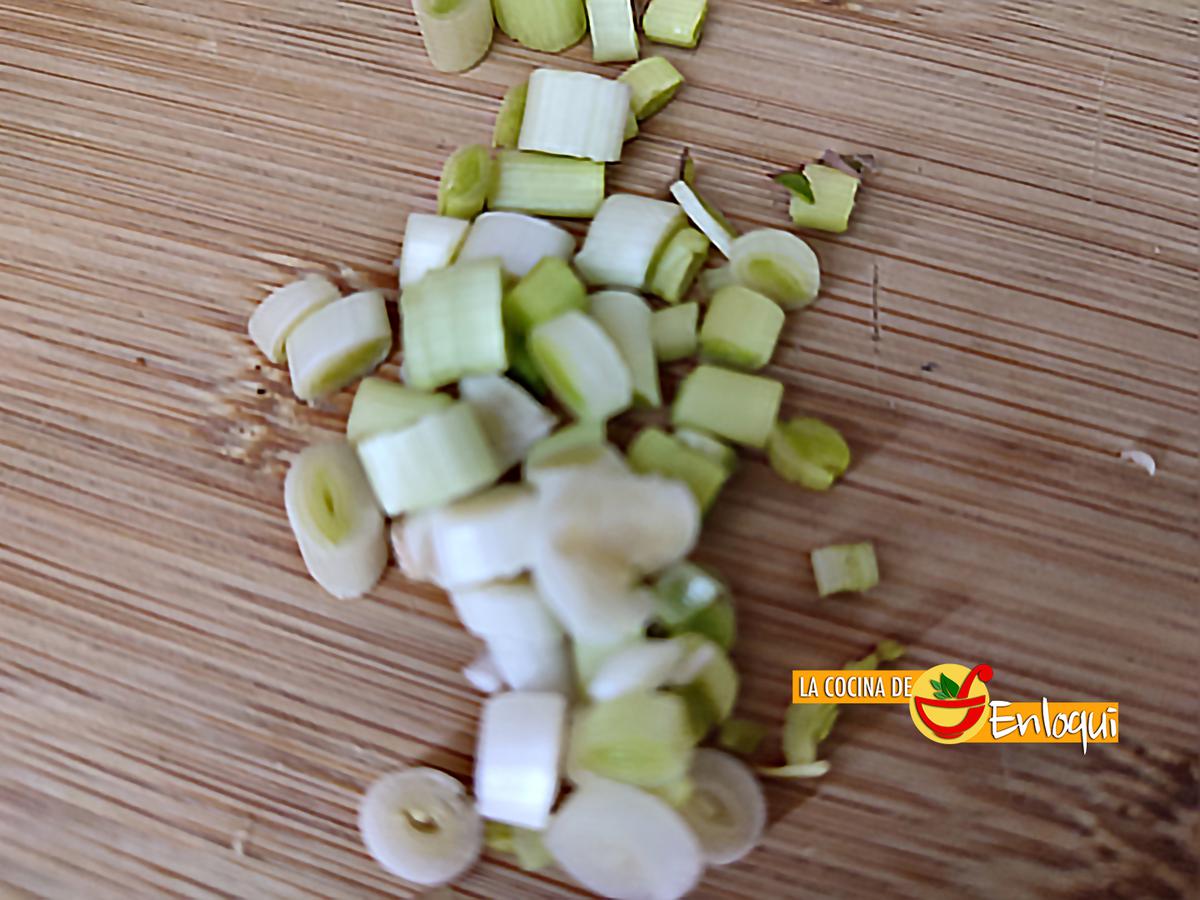 Ahora prepara todos los vegetales. Pela y corta en dados pequeños el calabacín. Pela y corta de igual manera la zanahoria. Trocea las setas y los espárragos. Pica finamente los ajos tiernos.