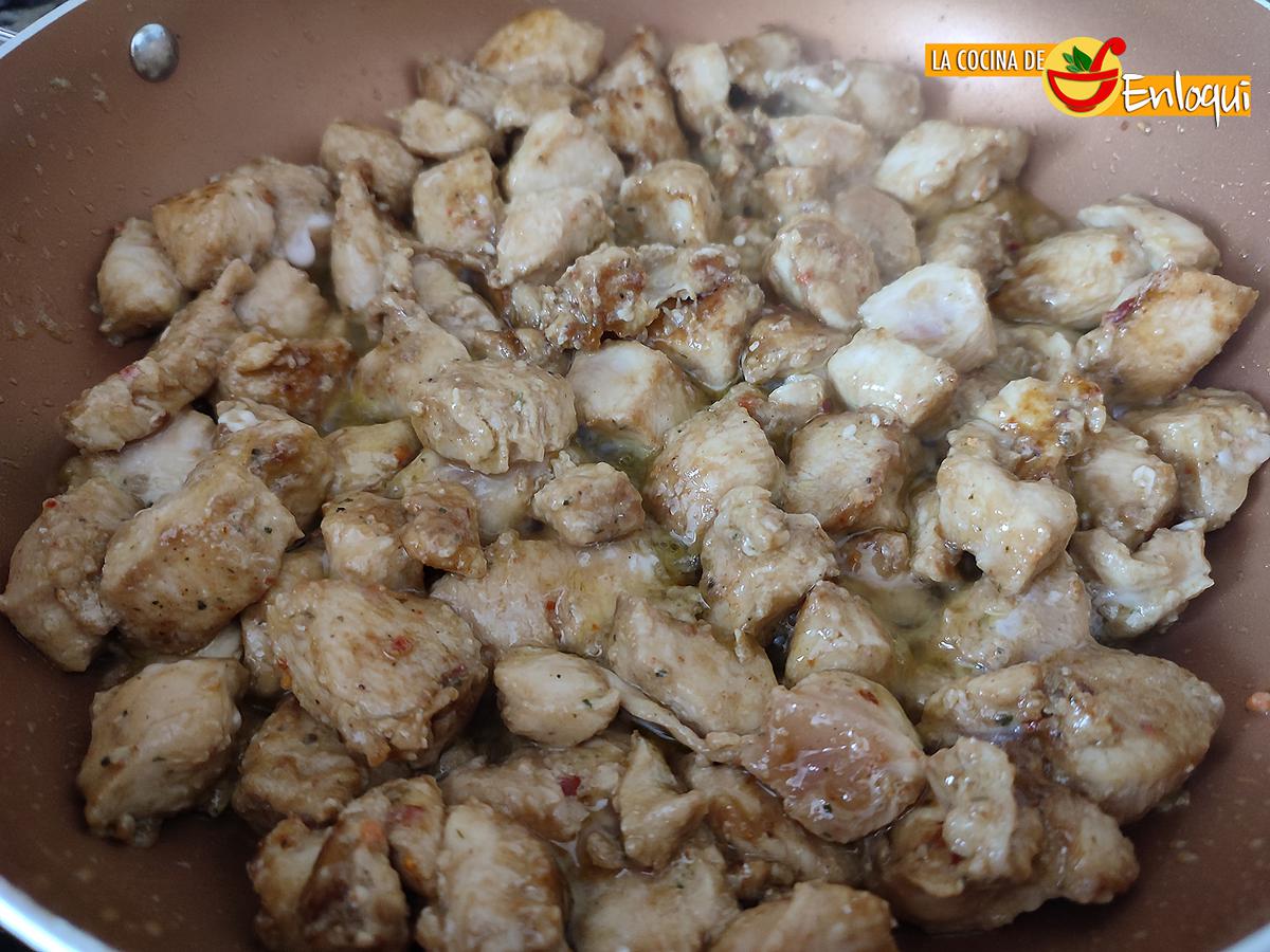 Cuando el pollo haya macerado los minutos indicados, échalo en una sartén amplia o wok con un fondo de aceite de oliva virgen extra. Cocina a fuego fuerte hasta que quede hecho y bien dorado. Después retira de la sartén y reserva.