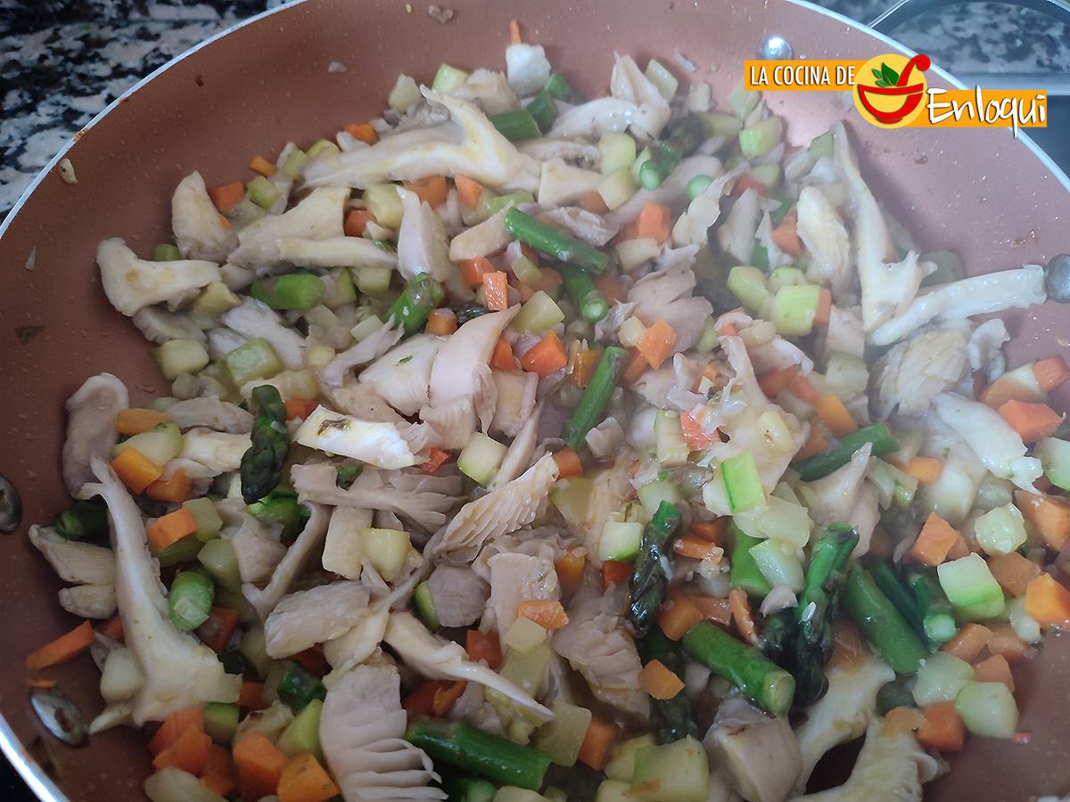 Después añade la zanahoria, los espárragos y las setas. Cocina 5 minutos más a fuego medio-fuerte.