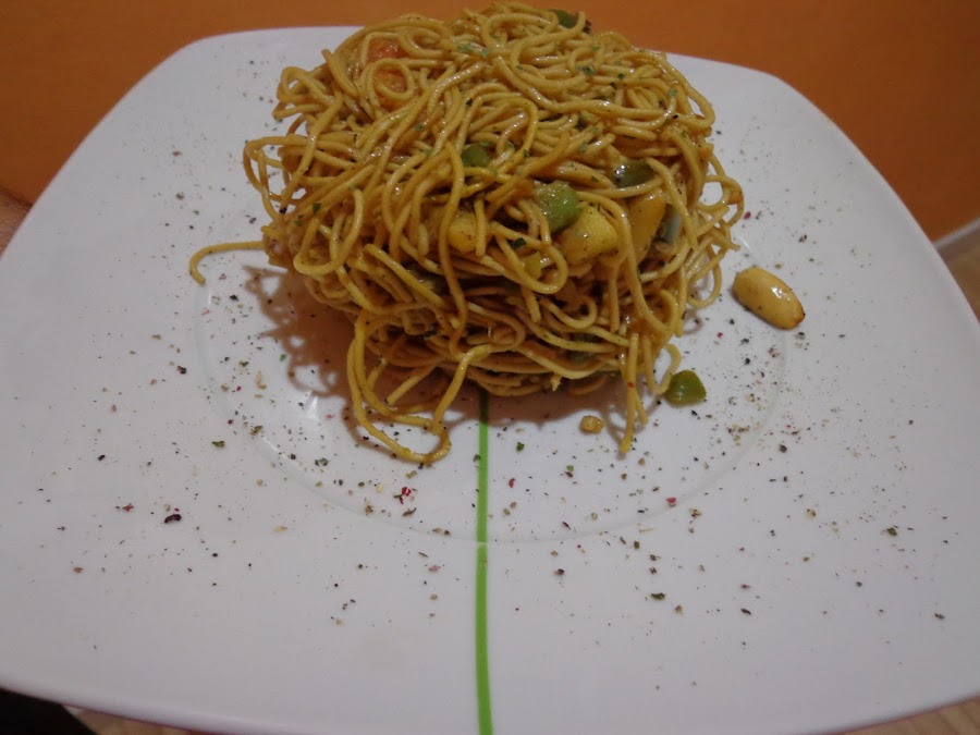 Añade todo los ingredientes y por último los fideos y darle unos minutos para que todo se integre bien.