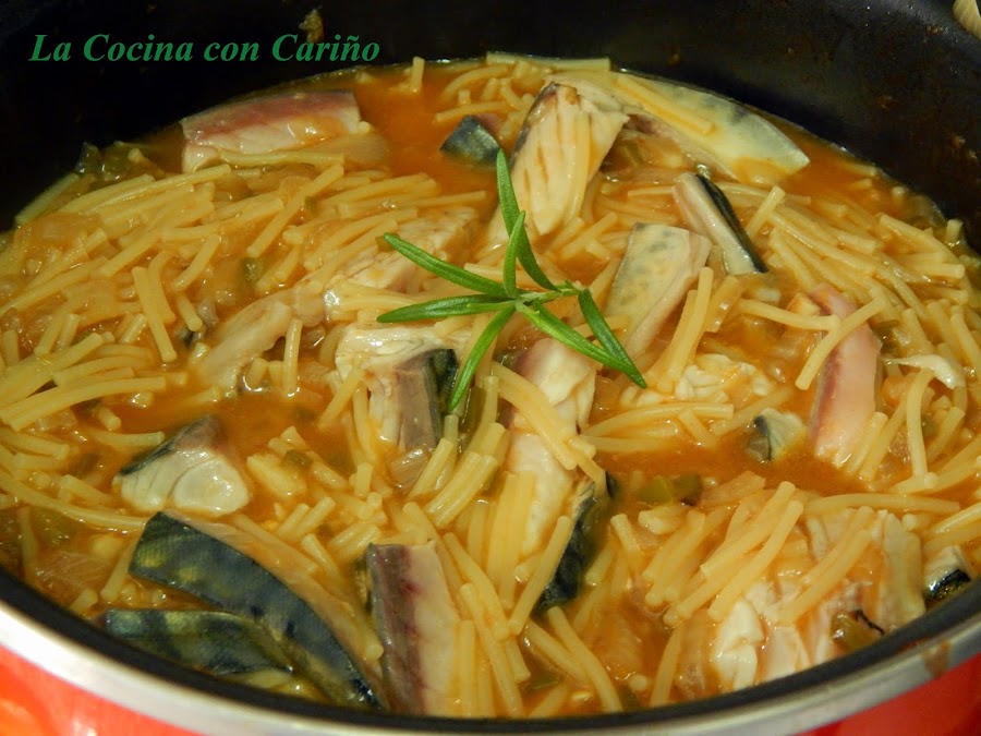Cuando están tiernos o casi tiernos los fideos, añadimos las caballas, removemos y apagamos. Tapamos y dejamos reposar un par de minutos. Decoramos con cebollino picado