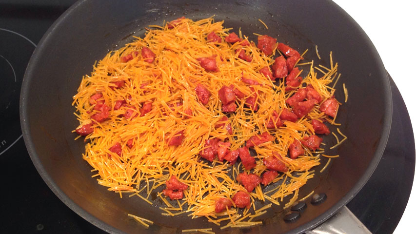 Doro los fideos en la propia grasa del chorizo, sin añadir aceite ni ninguna otra.