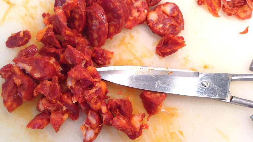 Corto las rodajas de chorizo en trocitos. Yo utilizo una tijera pero hazlo como prefieras.
