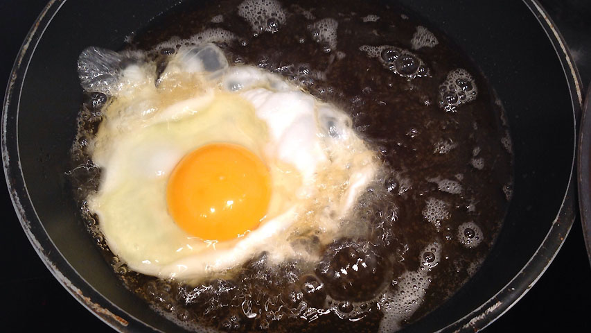En esta ocasión he frito un huevo con "puntilla". Abundante aceite bien caliente y huevos frescos.