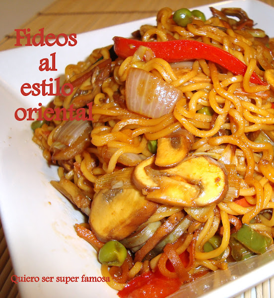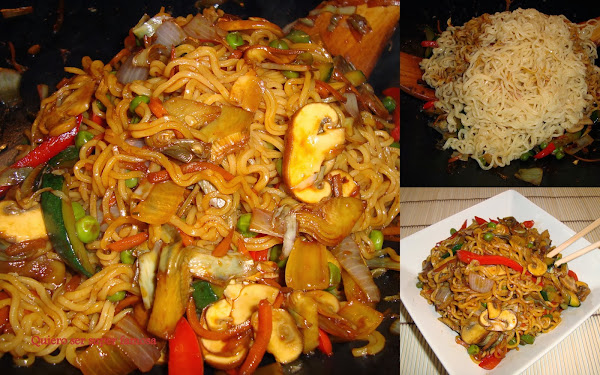 A continuación echar los fideos en el wok y mezclar bien con las hortalizas para que se impregnen de todos los sabores. Mantener el fuego unos segundos para que cojan algo de temperatura y servir inmediatamente.