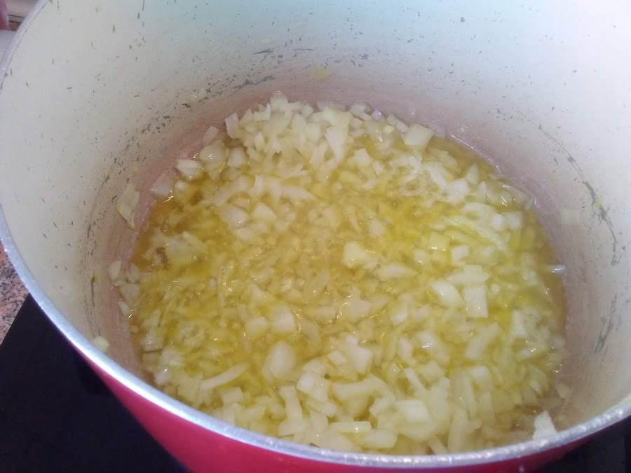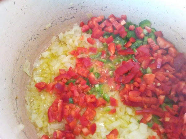 Cortar la cebolla y los pimientos verde y rojo en brunoise y lo s pochamos en una cazuela.