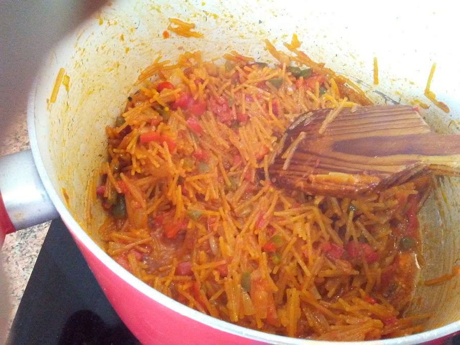 Volcamos la mitad de un paquete de 1/2 kg de fideos y los salteamos con la salsa hasta tostarlos un poco.