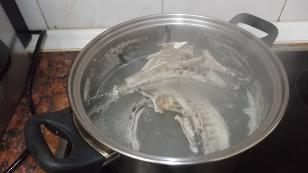 2. Con las espinas las metemos en una olla con agua y haremos un caldo para utilizar posteriormente.