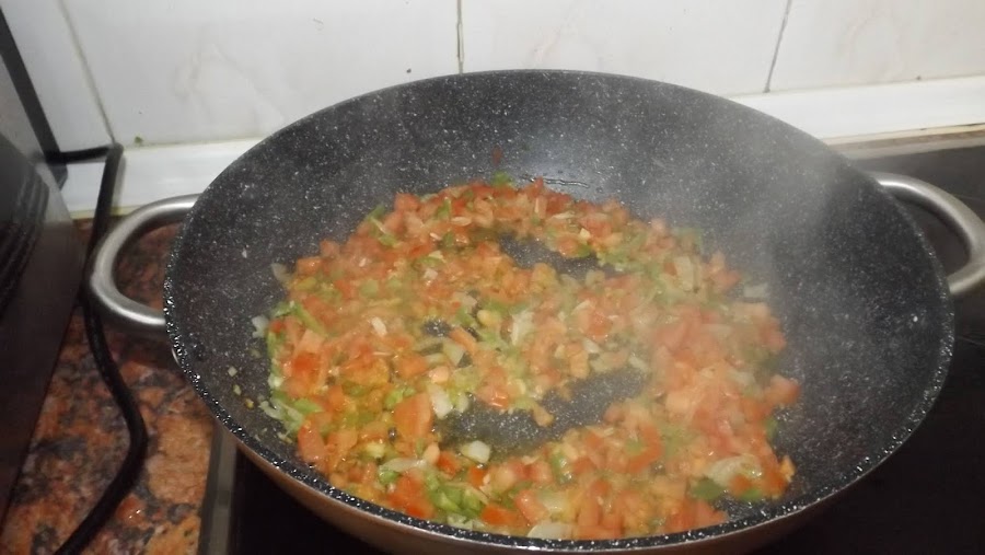3. Cortamos la verdura finamente a cuadro y pocharemos en aceite de oliva en donde metemos primero los ajos, cebolla y pimiento rehogaremos y una vez pochado metemos el tomate.