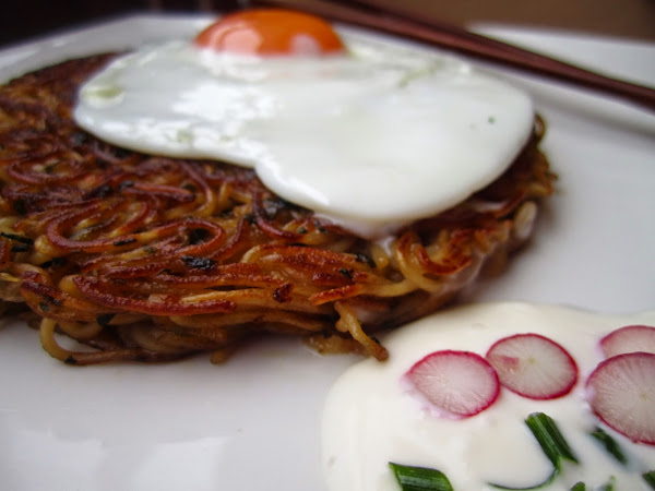 Entonces tuve una tercera idea de bombero. Pensé que sería una buena idea tostarlos en la sartén para secarlos un poco. En ello estaba cuando observe cómo los fideos comenzaban a dorarse y ordenarse en forma de una gran tortita de lo más apetecible. Después probé un trozo y me enamoré. Estaba buenísima.