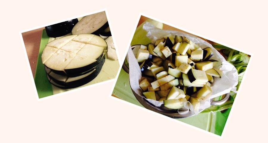 1. Lava la berenjena y el calabacín y córtalos a cuadraditos. Espolvoréalos con sal y déjalos reposar 10 minutos para que suelten el amargor y queden más jugosos.