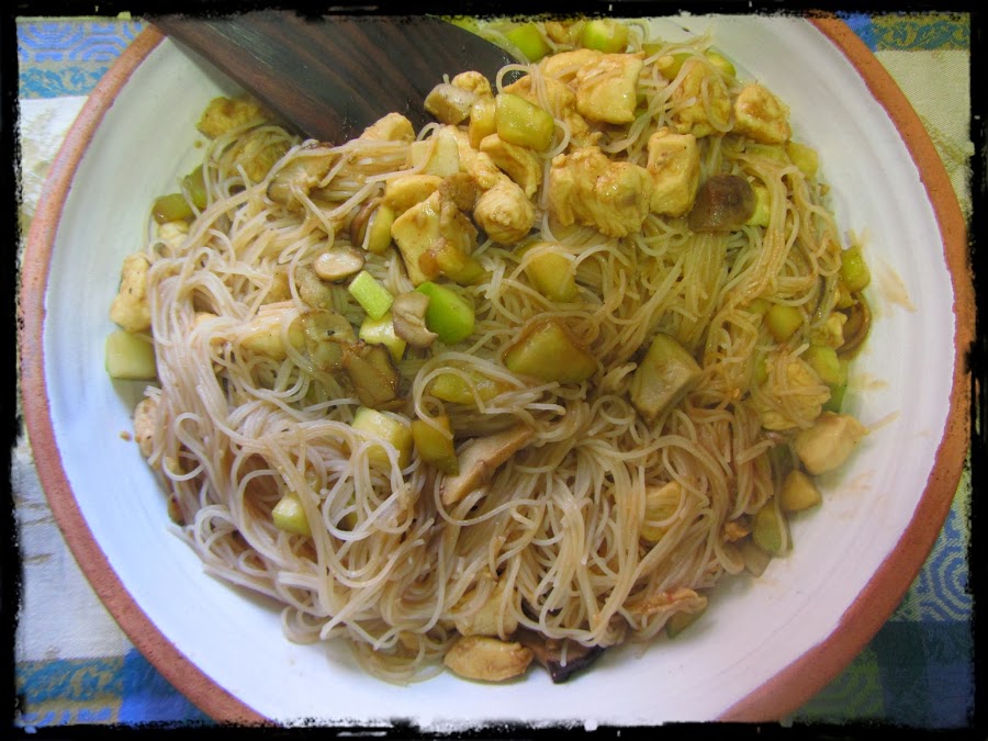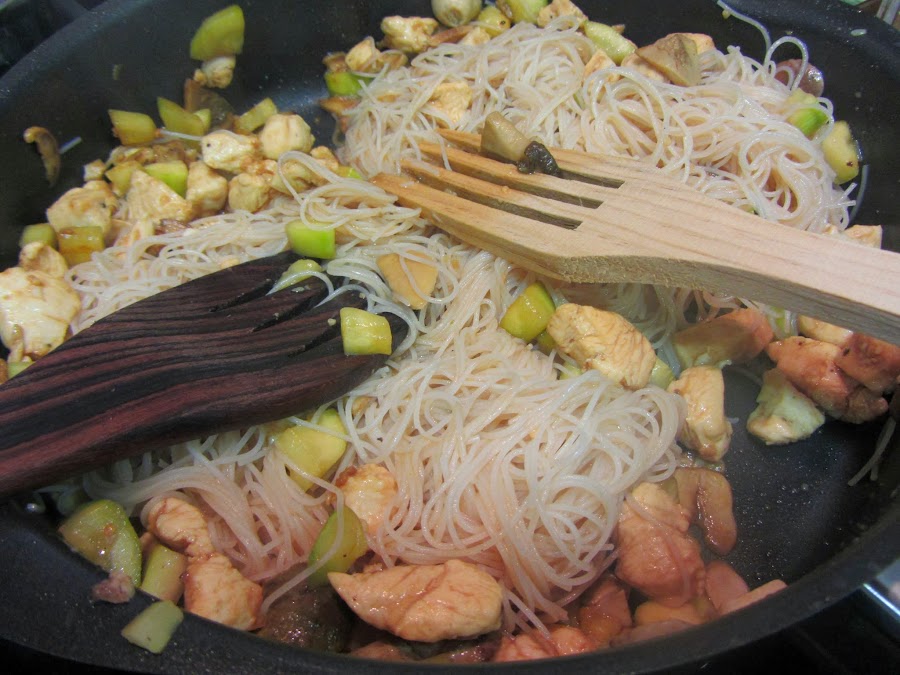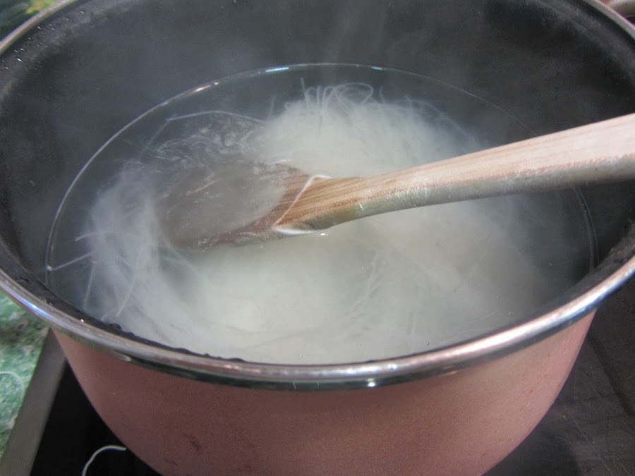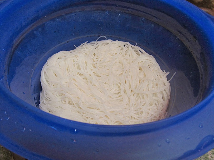 -Cocemos los fideos de arroz siguiendo las indicaciones del paquete: es decir, llevamos el agua a ebullición, retiramos del fuego en cuanto hierva, echamos los fideos, los dejamos bien cubiertos con el agua, y esperamos 4 minutos, sin remover.