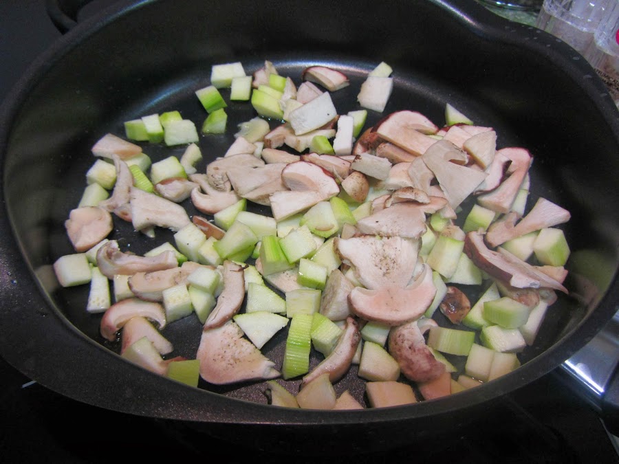 En un wok o sartén honda, echamos un chorrito de aceite, calentamos un minuto, y ponemos el calabacín y las setas.