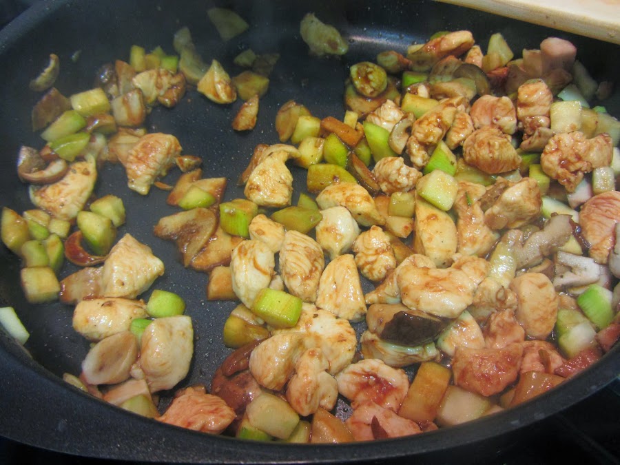 Destapamos, y añadimos el pollo y un chorro de salsa de soja, al gusto. Salteamos a fuego más vivo durante 5 minutos, mezclando bien con una espátula o cuchara de madera para que se haga todo por igual.