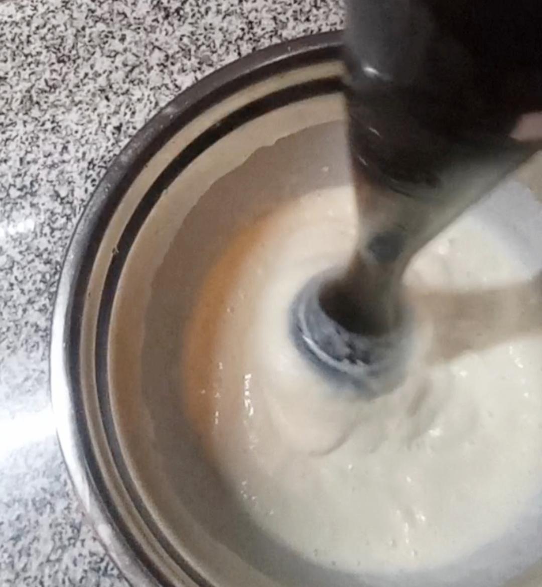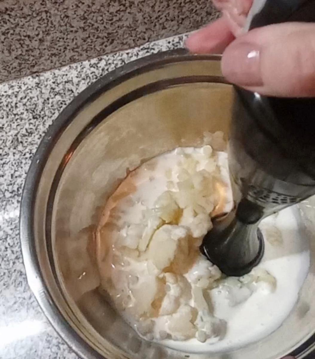5- Mientras mixear la coliflor con la crema, leche, mostaza, sal, y condimentos., hasta que quede una crema bien lisa.