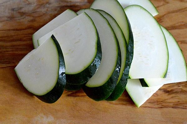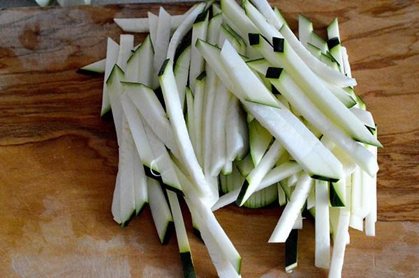 Cortamos también el calabacín, primero en rodajas y luego en bastoncillos.