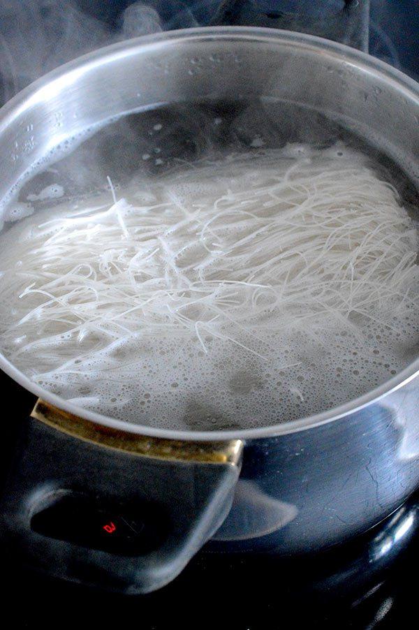 Ponemos los fideos a remojo retirando el agua del fuego, en 5 minutos estarán listos.