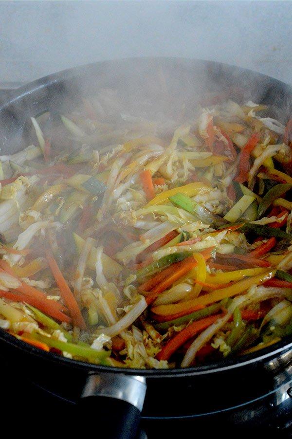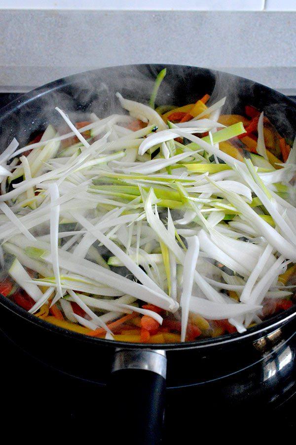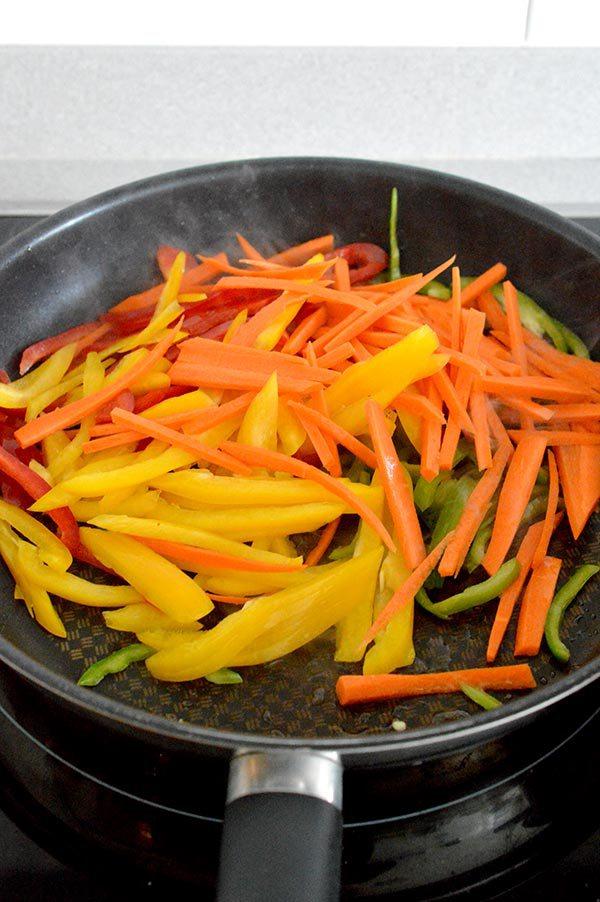 Añadimos la zanahoria y los pimientos y cocinamos a fuego fuerte 2-3 minutos.