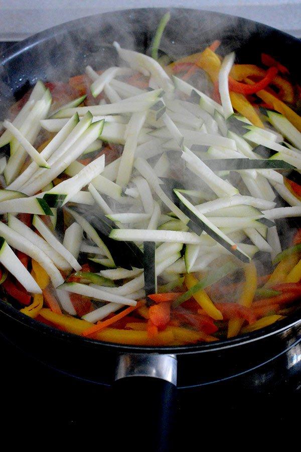 A continuación añadimos el calabacín y la col, junto con un chorro de salsa de soja y un chorrito de salsa de pescado. Salteamos otros 2-3 minutos mas.