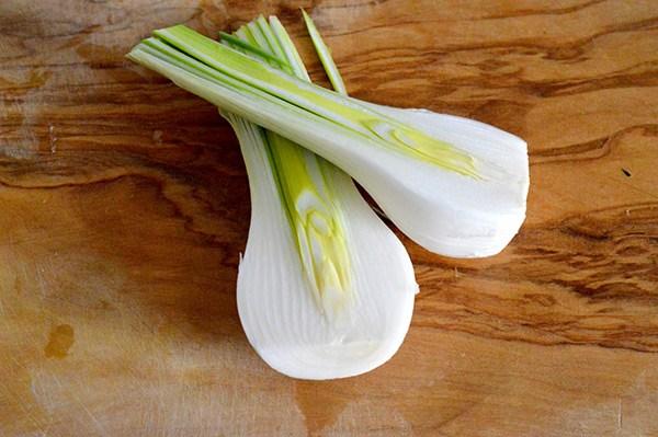 Cortamos la cebolleta longitudinalmente reservando el tallo para mas tarde.