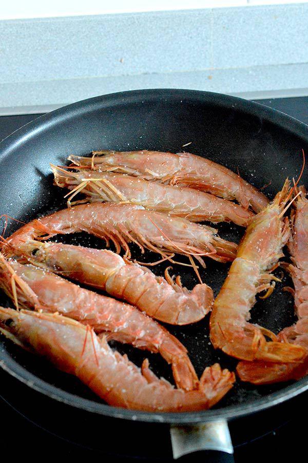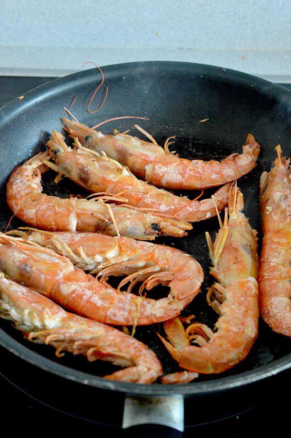 En otra sartén hacemos las gambas a la plancha. También las podéis pelar y añadirlas al salteado.