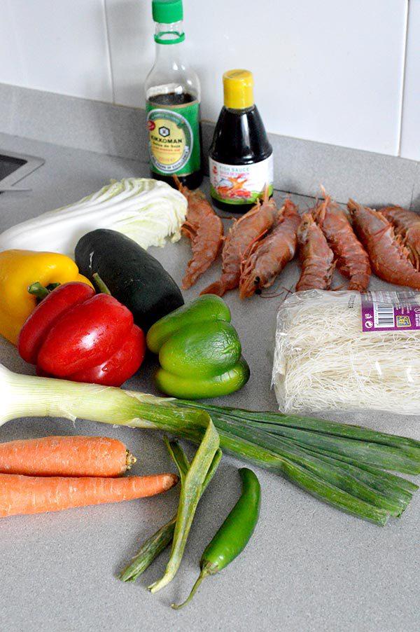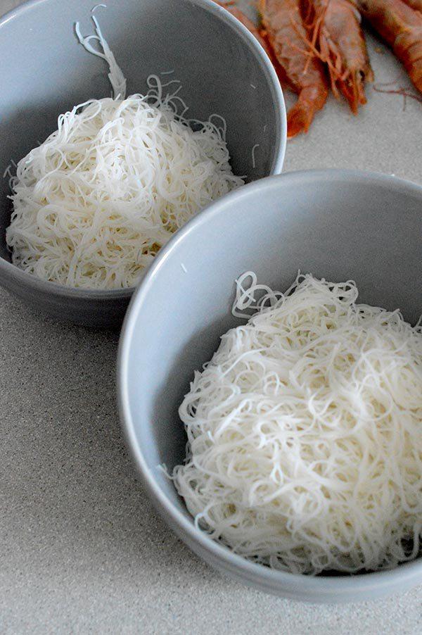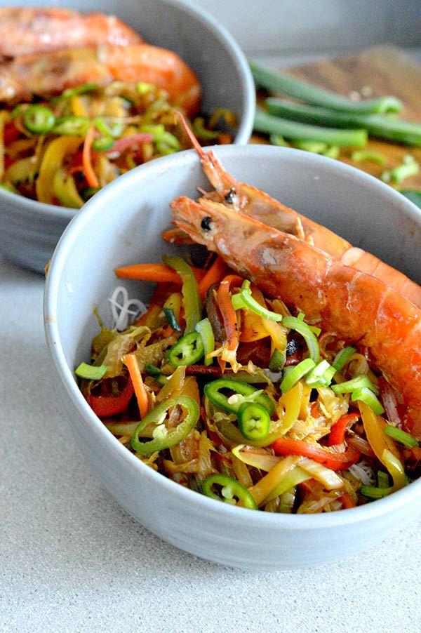 Servimos los fideos en un bol y encima las verduras, y dos o tres gambones!