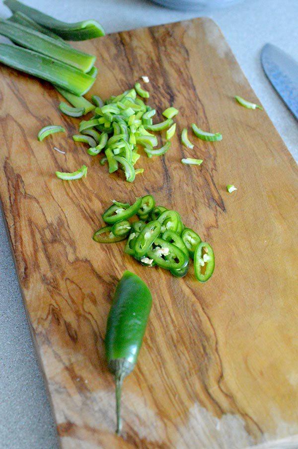 Cortamos unas rodajitas de guindilla y los tallos de la cebolleta para añadirlo una vez servido!