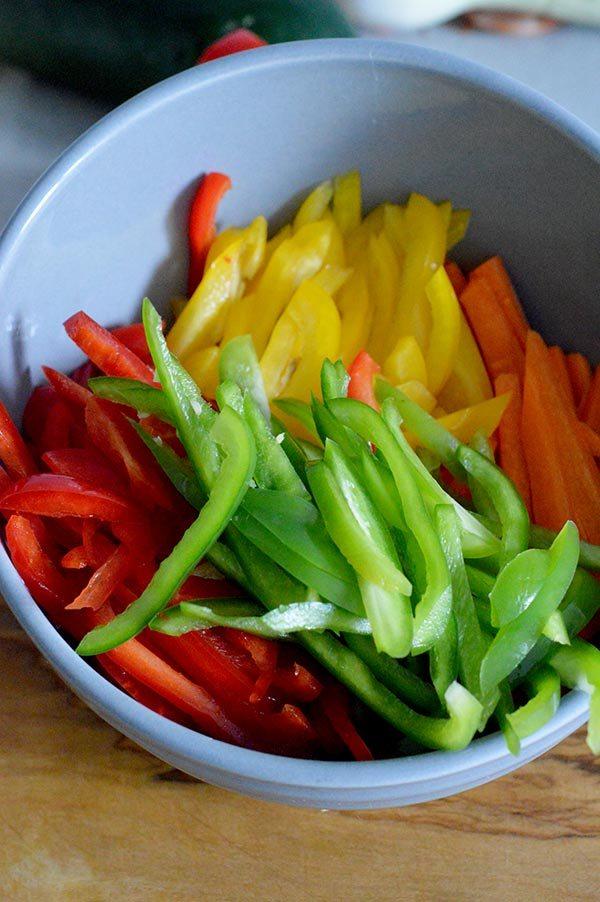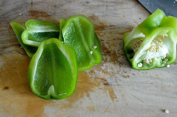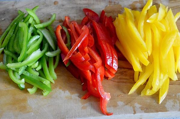 Limpiamos y cortamos los pimientos, verde, rojo y amarillo.